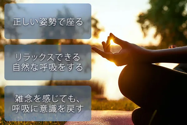 呼吸に集中することで集中力が高まり、雑念を消して瞑想に没頭できるようになります。いったん意識が外へ反れても、呼吸を整えると再び集中できます。