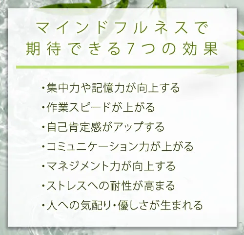 マインドフルネスには、様々な効果があると言われています。ここからは、マインドフルネスで期待できる7つの効果について、詳しく解説していきます。