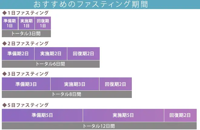 なお、ファスティングが5日間以上になると体調を崩す方もいるので、準備期間から回復期間までしっかり体調管理ができる人に向いています。