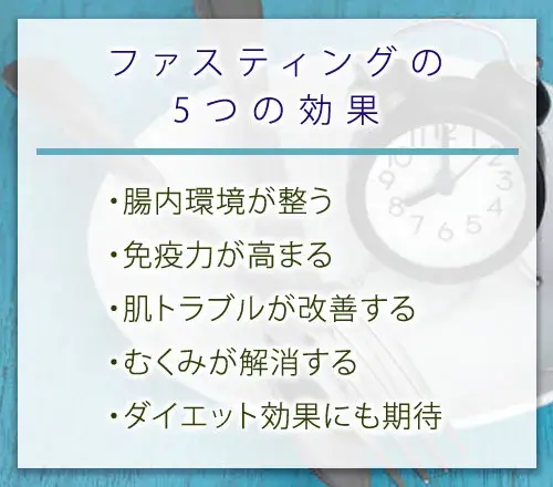 ファスティングには、様々な効果があると言われています。ここからは、ファスティングに期待できる5つの効果について、詳しく解説していきます。
