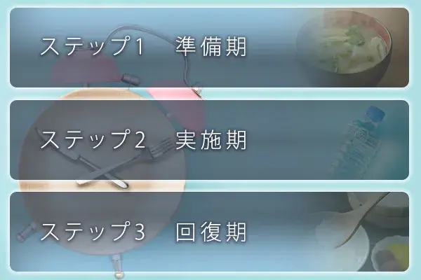 ここからは、ファスティングの正しいやり方について、解説していきます。ファスティングは、いきなり食事の量を減らしたり、断食を行ったりせず、3つのステップに分けて行うのが一般的なやり方です。